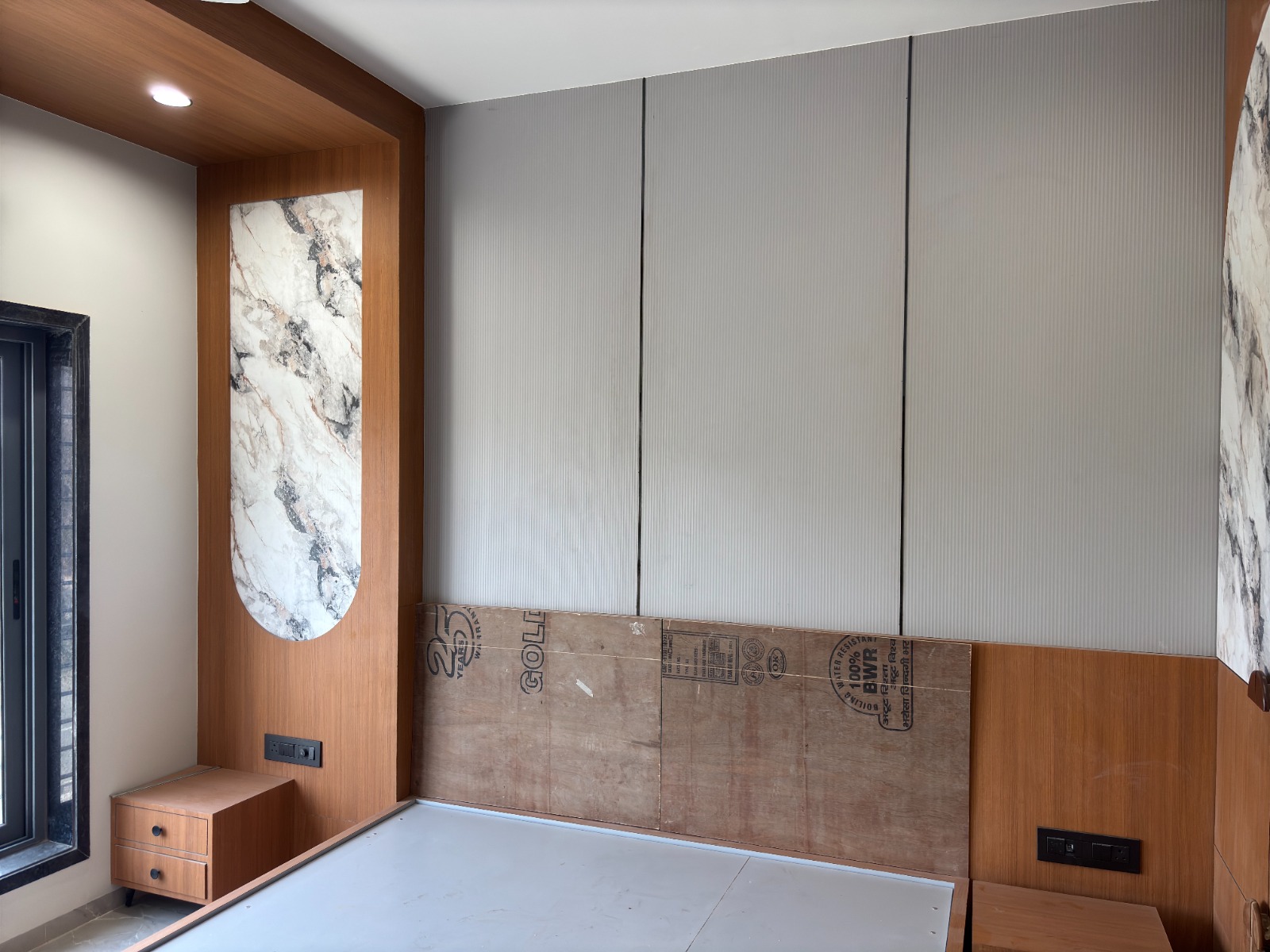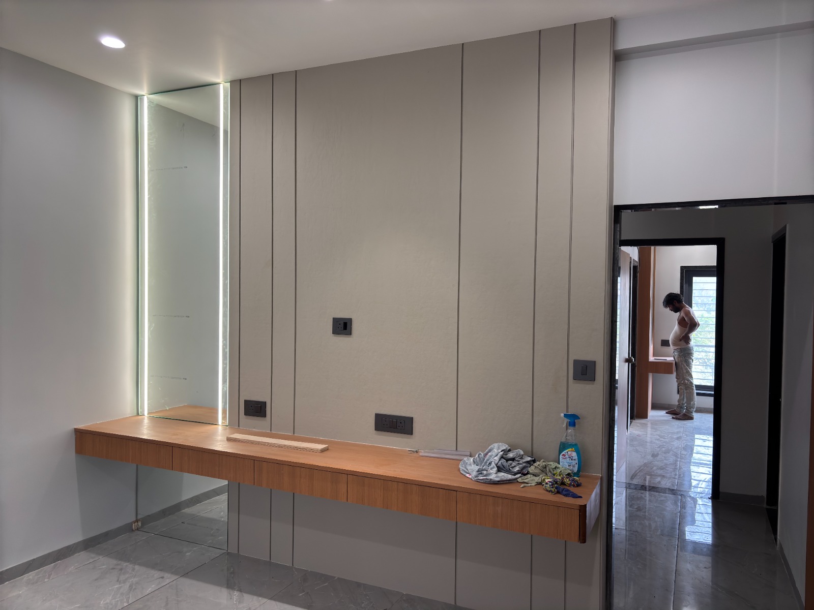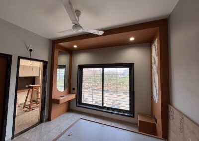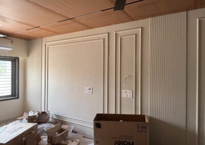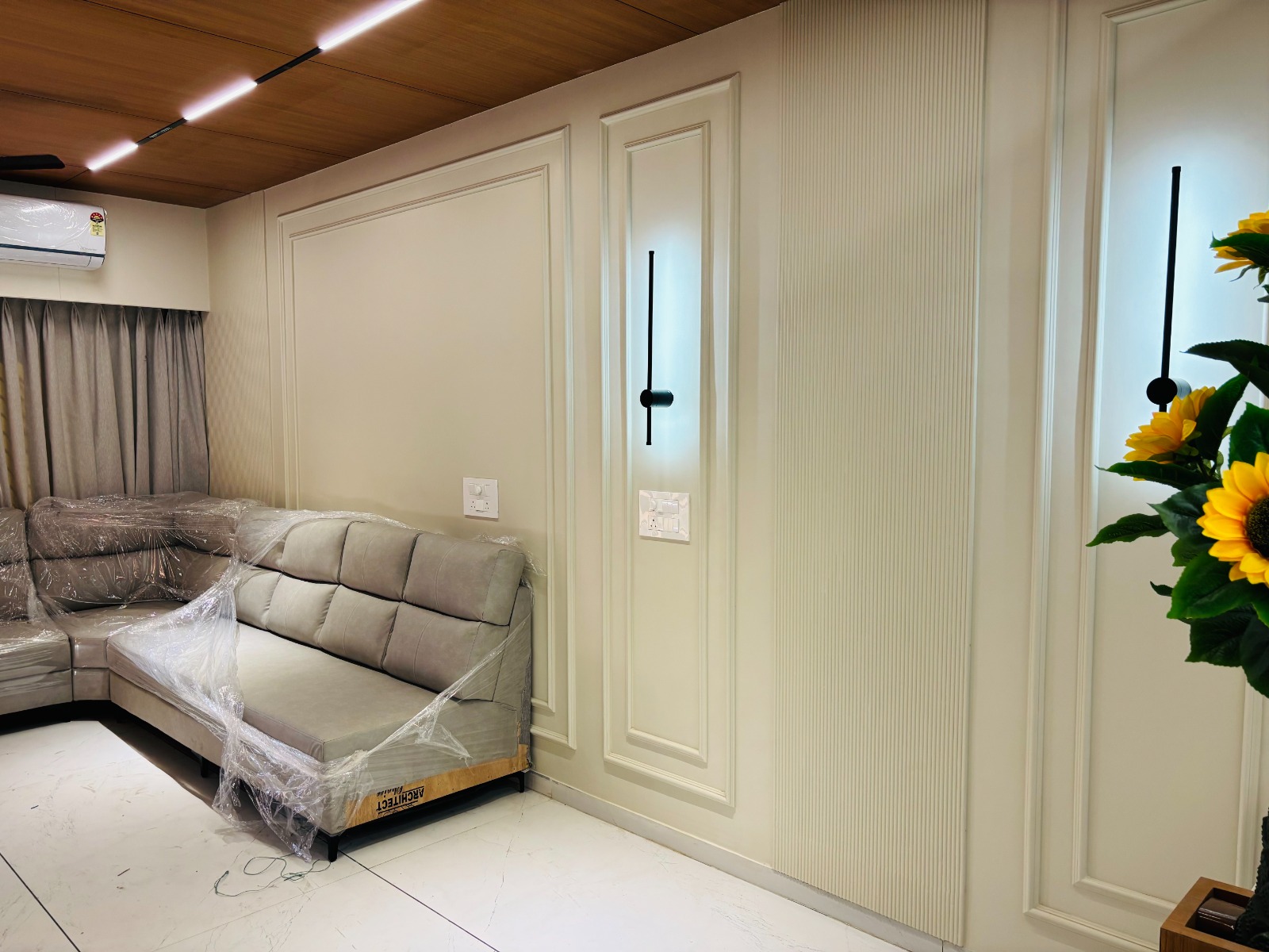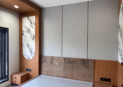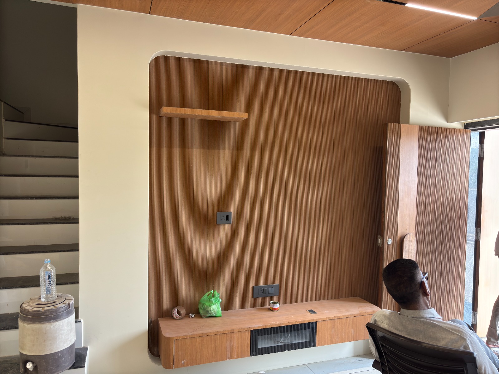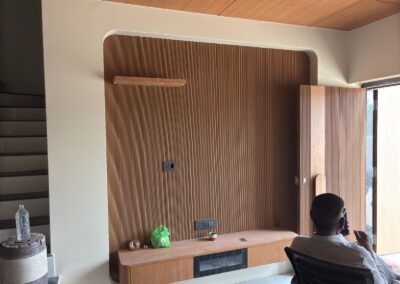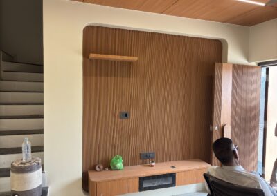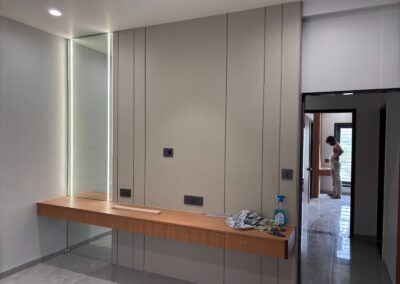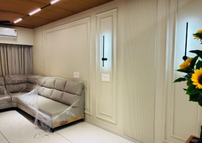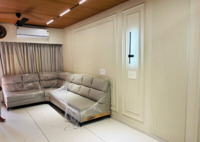 We created a modern TV unit along with aesthetic wall paneling to enhance the living room’s visual appeal. The design blends functionality with style, offering a clean and sophisticated look.