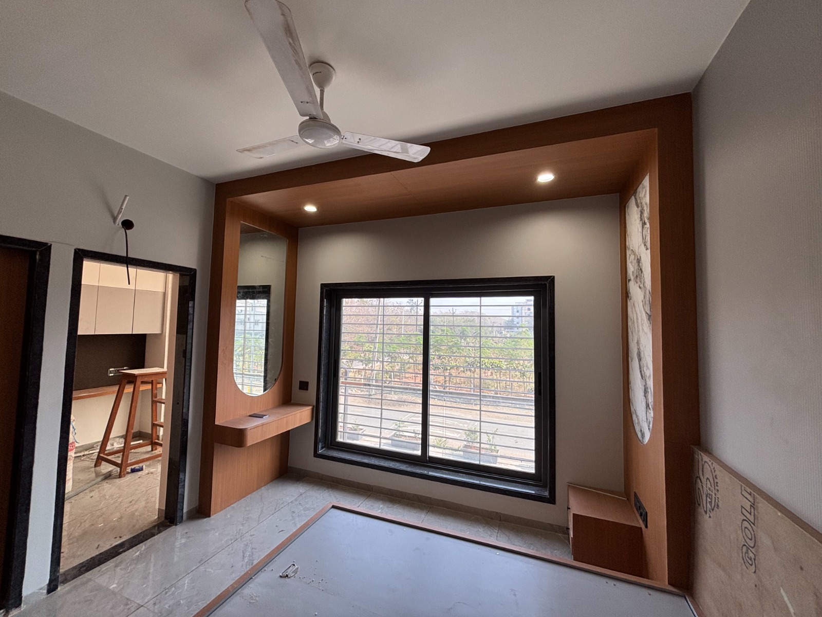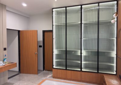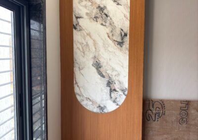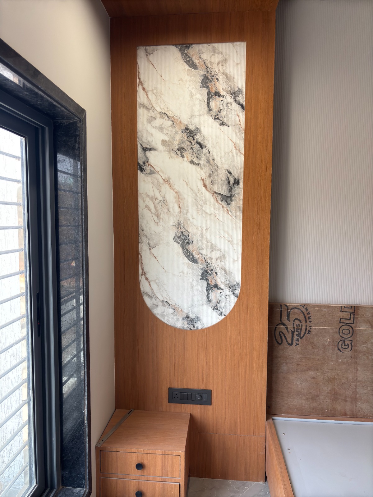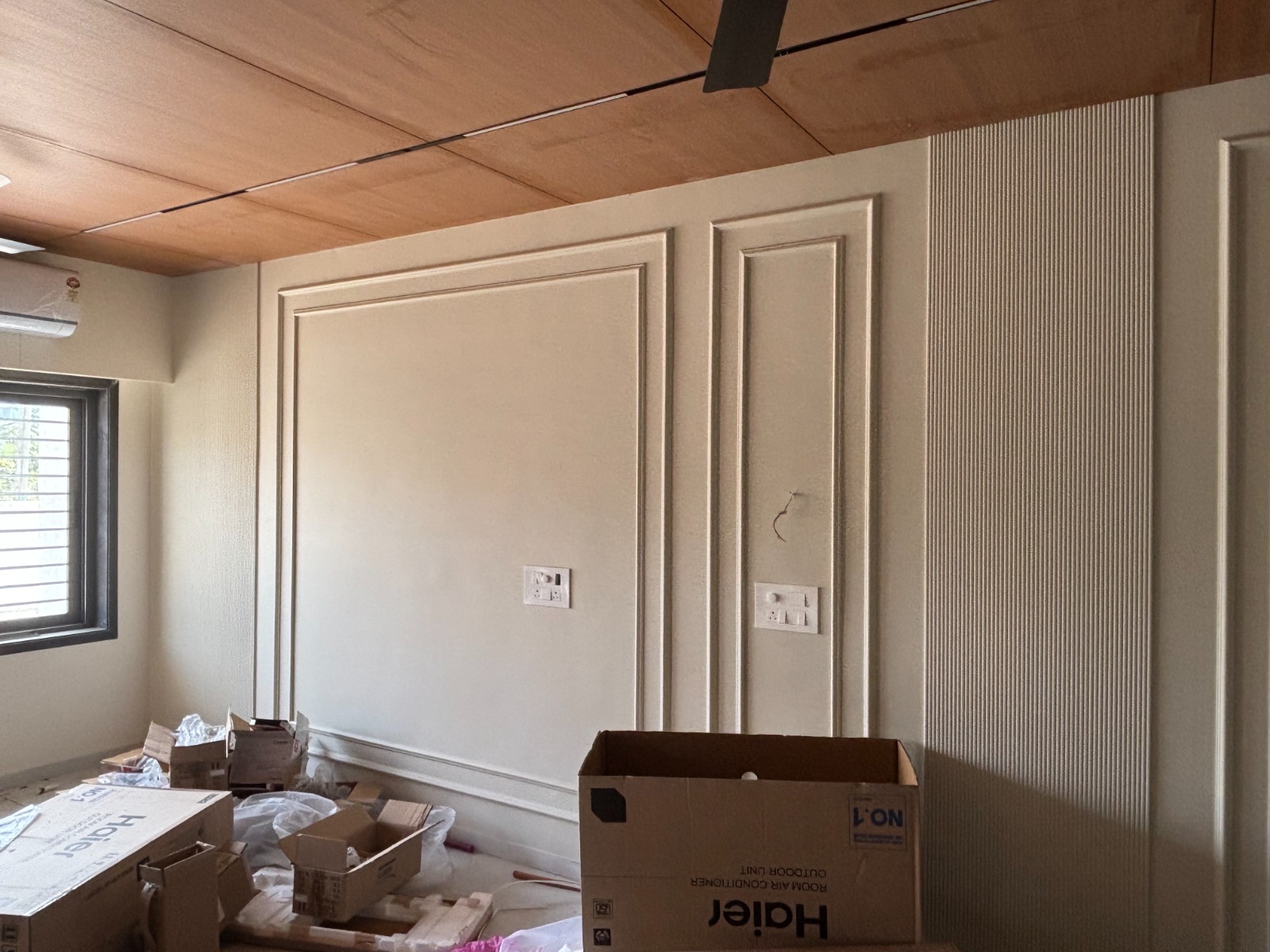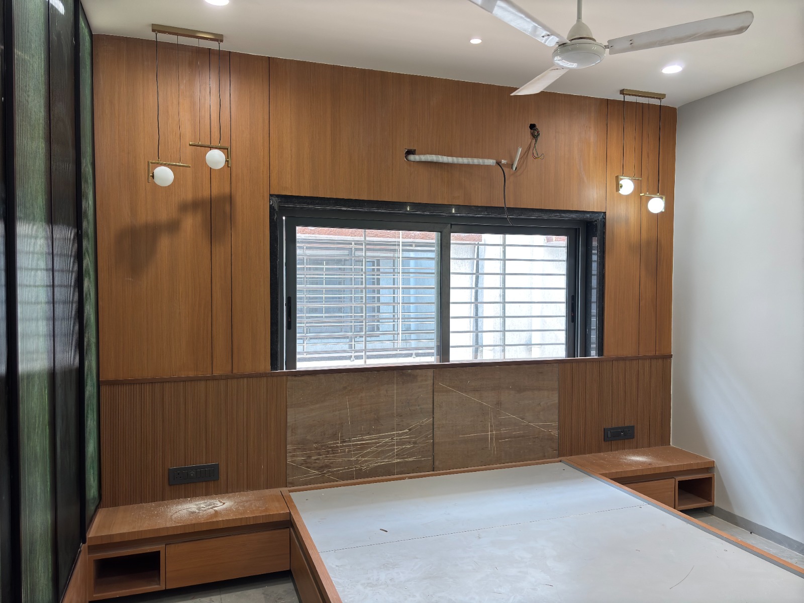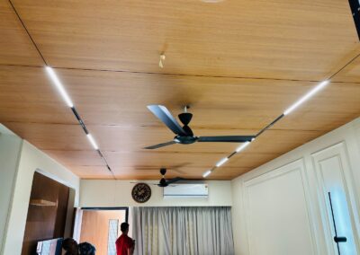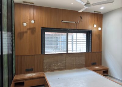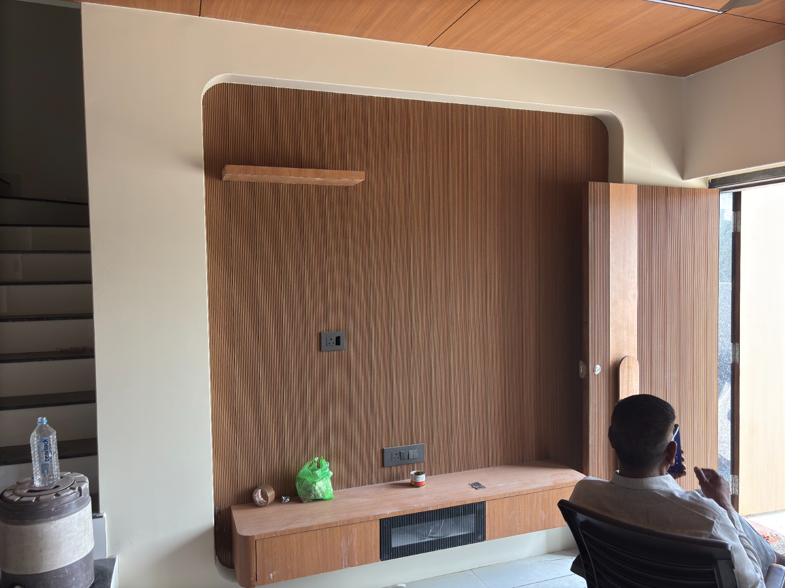 We created a modern TV unit along with aesthetic wall paneling to enhance the living room’s visual appeal. The design blends functionality with style, offering a clean and sophisticated look.
